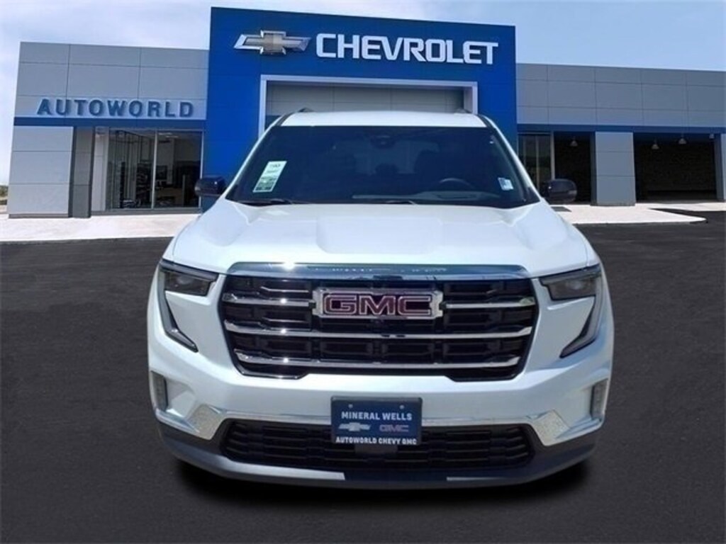 This 2025 GMC Acadia Elevation in White Frost Tricoat comes with the following features: 2.5L DOHC 8-Speed Automatic FWD Elevation Premium Package (3-Channel Programmable Universal Home Remote, 6-Way Power Front Passenger Seat Adjuster, 7-Passenger Seating (2-2-3 Seating Configuration), Auto-Dimming Inside Rear-View Mirror, CoreTec Seat Trim, Front Passenger Power Lumbar Seat Adjuster, and Wheels: 20 x 8 Bright Silver Aluminum), Luxury Package (8 Diagonal Head-Up Display, Heated Rear Outboard Seating Positions, Heated Wiper Park, and Laminated Acoustic Glass), Preferred Equipment Group 4SC, Navigation System, 12 Speakers, 18 x 7.5 Aluminum Wheels, 2-Way Driver Power Lumbar Seat Adjuster, 3.49 Final Drive Axle Ratio, 3rd row seats: split-bench, 4-Way Manual Front Passenger Seat Adjuster, 4-Wheel Disc Brakes, 8-Passenger Seating (2-3-3 Seating Configuration), 8-Way Power Driver Seat Adjuster, ABS brakes, Air Conditioning, Alloy wheels, AM/FM radio: SiriusXM with 360L, Apple CarPlay/Android Auto, Auto High-beam Headlights, Auto-dimming Rear-View mirror, Automatic temperature control, Bodyside moldings, Brake assist, Bumpers: body-color, Cloth Seat Trim, Compass, Delay-off headlights, Driver door bin, Driver vanity mirror, Dual front impact airbags, Dual front side impact airbags, Electronic Stability Control, Emergency communication system: OnStar Services capable, Exterior Parking Camera Rear, Four wheel independent suspension, Front anti-roll bar, Front Bucket Seats, Front Center Armrest, Front dual zone A/C, Front fog lights, Front License Plate Bracket, Front reading lights, Fully automatic headlights, Heated door mirrors, Heated front seats, Heated steering wheel, Illuminated entry, Leather steering wheel, Low tire pressure warning, Occupant sensing airbag, Outside temperature display, Overhead airbag, Overhead console, Panic alarm, Passenger door bin, Passenger vanity mirror, Power door mirrors, Power driver seat, Power Liftgate, Power steering, Power windows, Radio data system, Rear air conditioning, Rear anti-roll bar, Rear reading lights, Rear seat center armrest, Rear side impact airbag, Rear window defroster, Rear window wiper, Remote keyless entry, Security system, Speed control, Speed-sensing steering, Split folding rear seat, Spoiler, Sport steering wheel, Steering wheel mounted audio controls, Tachometer, Telescoping steering wheel, Tilt steering wheel, Traction control, Trip computer, Turn signal indicator mirrors, Variably intermittent wipers, and Voltmeter.